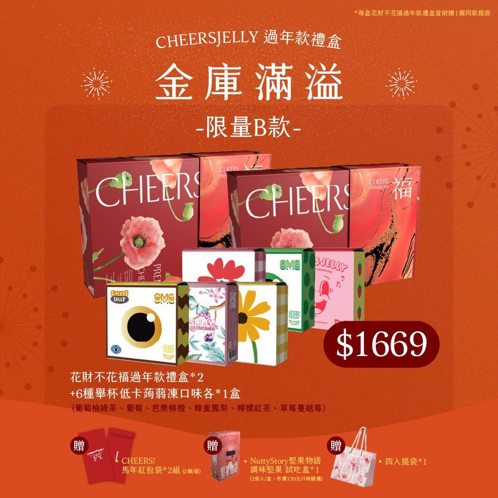 舉杯低卡蒟蒻凍《花財不花福過年款禮盒》金庫滿溢組-B款(8盒共56根,附提袋) 水蜜桃 葡萄柚綠茶 冬瓜檸檬 柳橙春烏龍 梅子綠茶 蜂蜜柚子 葡萄 百香果 芭樂柳橙 蜂蜜鳳梨 檸檬紅茶 草莓蔓越莓