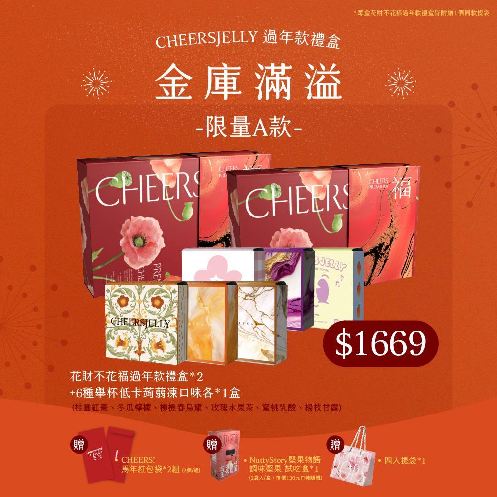 舉杯低卡蒟蒻凍《CHEERSJELLY 燦金福氣箱》新年大補給(3箱共54根,附提袋)楊枝甘露 草莓蔓越莓 蜜柚烏龍 葡萄 百香果 蜂蜜鳳梨 水蜜桃 葡萄柚綠茶 蜂蜜檸檬