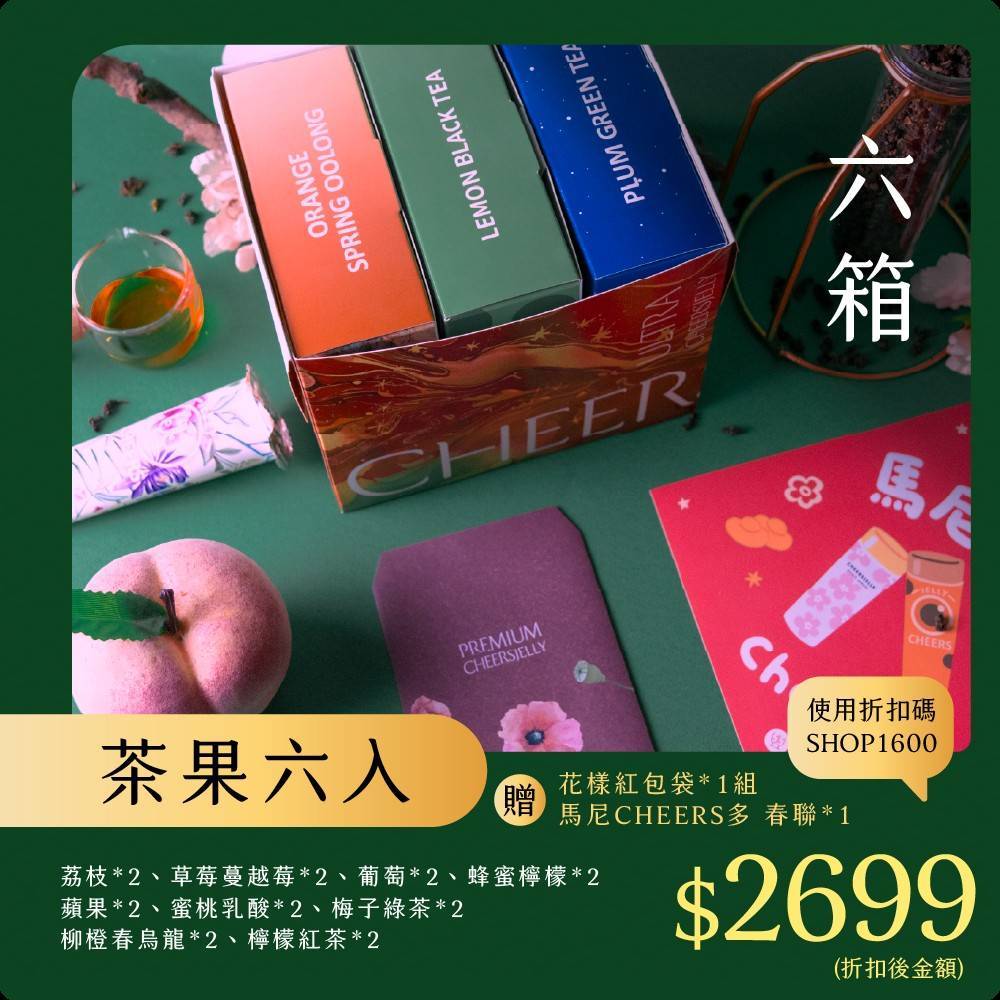 舉杯低卡蒟蒻凍《CHEERSJELLY 燦金福氣箱》茶果六入(6箱共108根,附提袋)荔枝*2 草莓蔓越莓*2 葡萄*2 蜂蜜檸檬*2 蘋果*2 蜜桃乳酸*2 梅子綠茶*2 柳橙春烏龍*2 檸檬紅茶*2