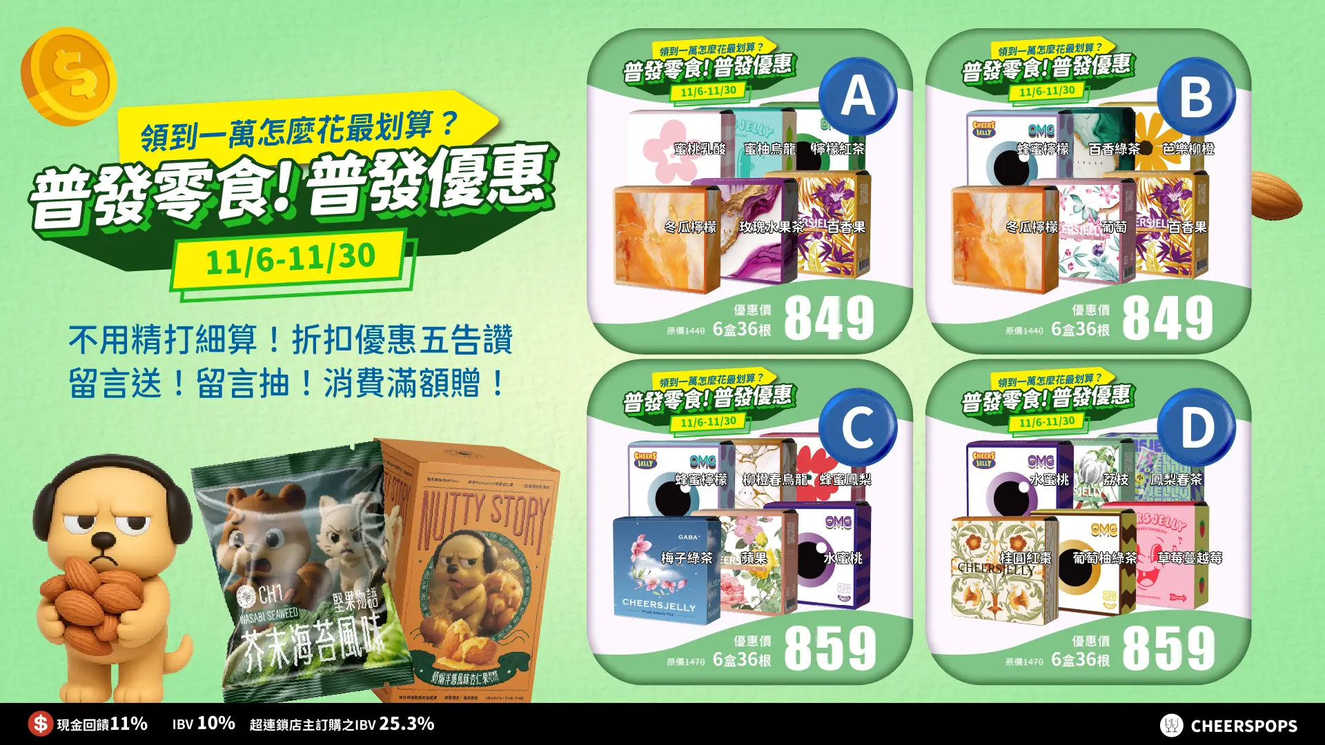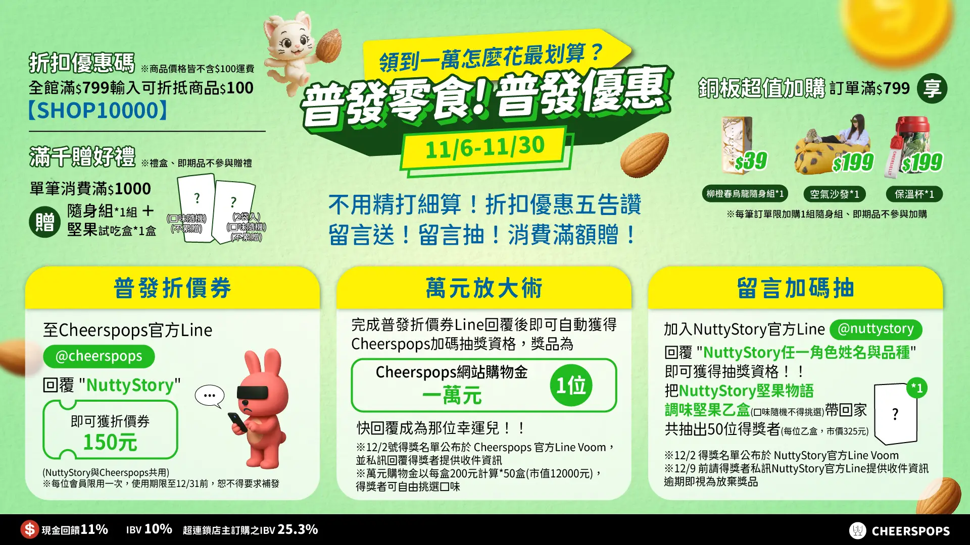 : 11月6到11月30日,請加入官方LINE(@cheerspops)點選下方選單領取折扣碼