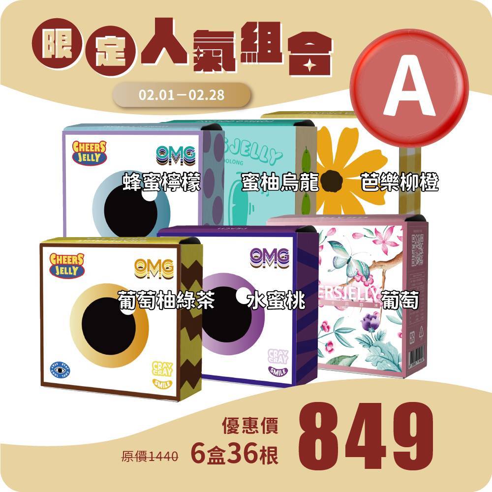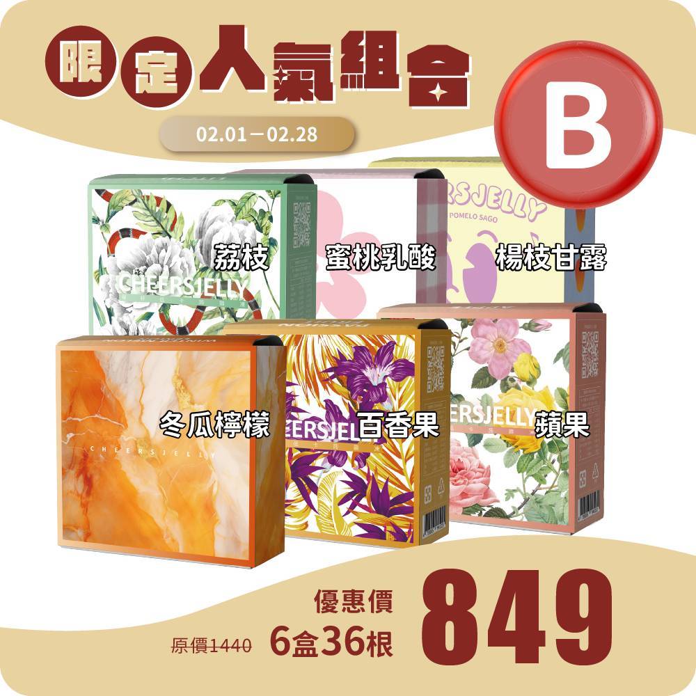 CHEERSJELLY 【限定人氣組合】舉杯低卡蒟蒻凍(6盒共36根入)葡萄 水蜜桃 蜂蜜檸檬 蜜柚烏龍 芭樂柳橙 葡萄柚綠茶
