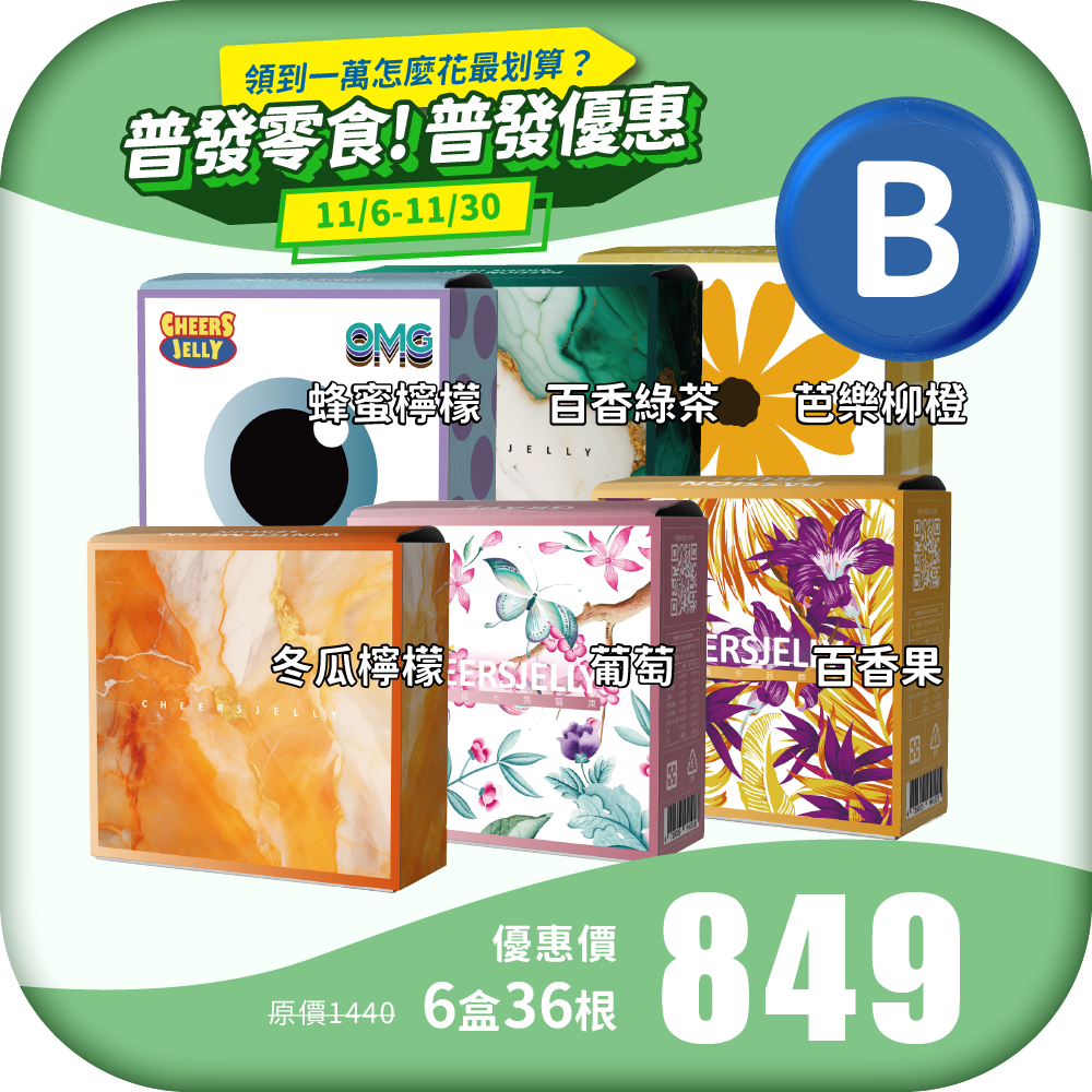 CHEERSJELLY 【普發零食! B】舉杯低卡蒟蒻凍(6盒共36根)冬瓜檸檬 葡萄 百香果 蜂蜜檸檬 百香綠茶 芭樂柳橙