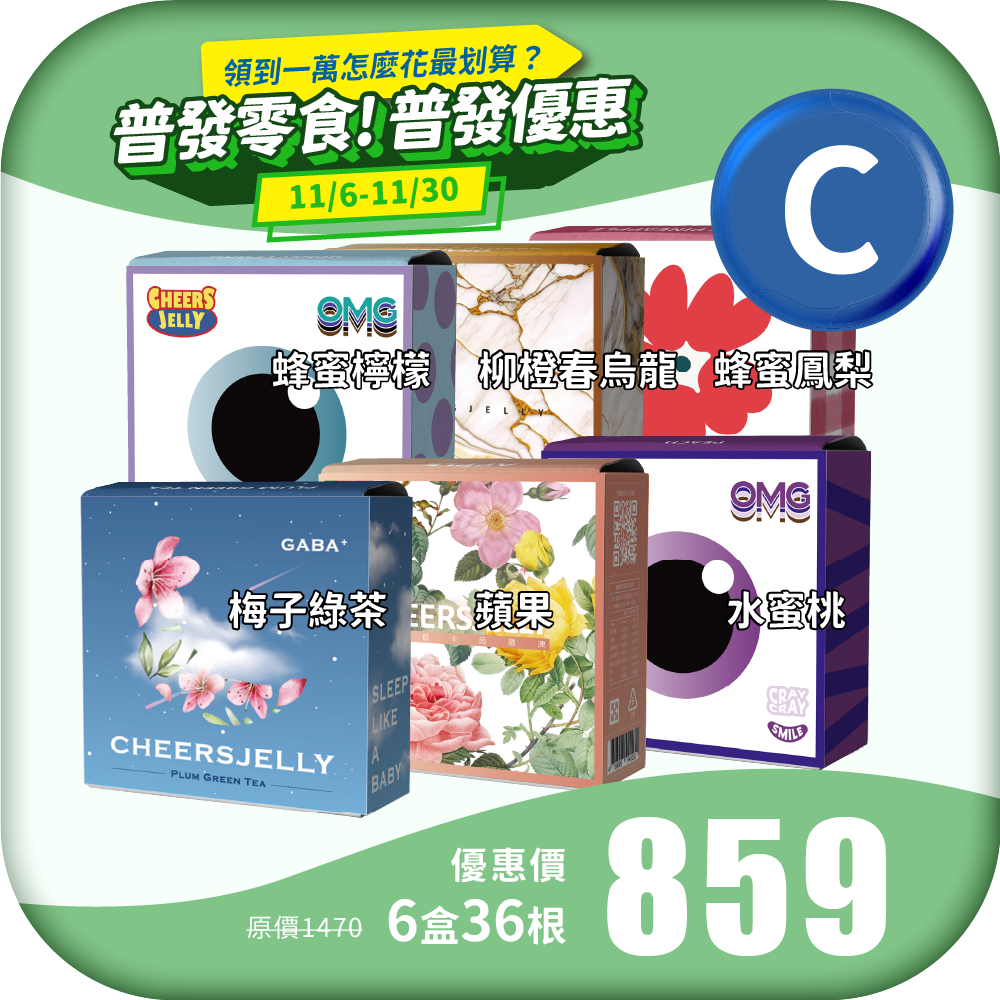 CHEERSJELLY 【普發零食! C】舉杯低卡蒟蒻凍(6盒共36根)梅子綠茶 蘋果 水蜜桃 蜂蜜檸檬 柳橙春烏龍 蜂蜜鳳梨