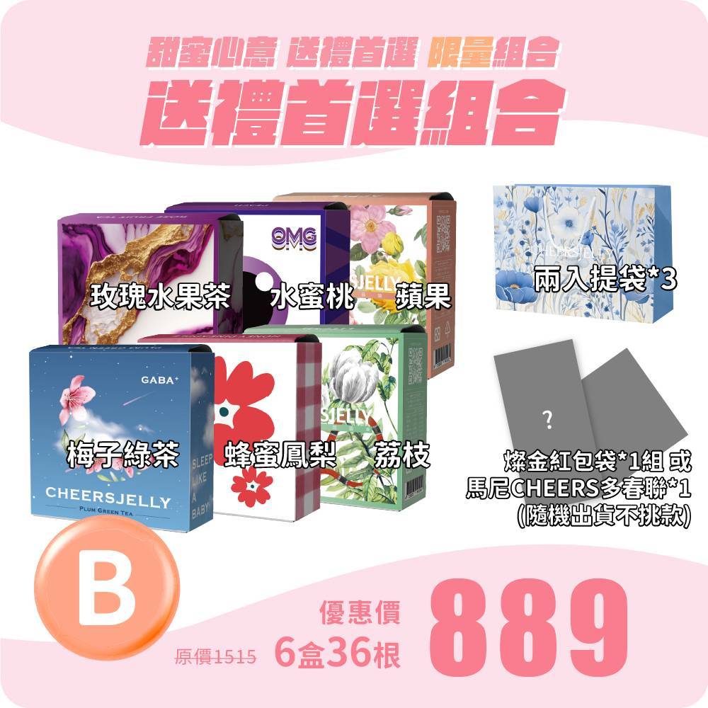 CHEERSJELLY 【送禮首選組合B】舉杯低卡蒟蒻凍(6盒共36根入)水蜜桃 蘋果 荔枝 蜂蜜鳳梨 玫瑰水果茶 梅子綠茶,附兩入提袋*3(燦金紅包袋或春聯 擇1,隨機出貨)