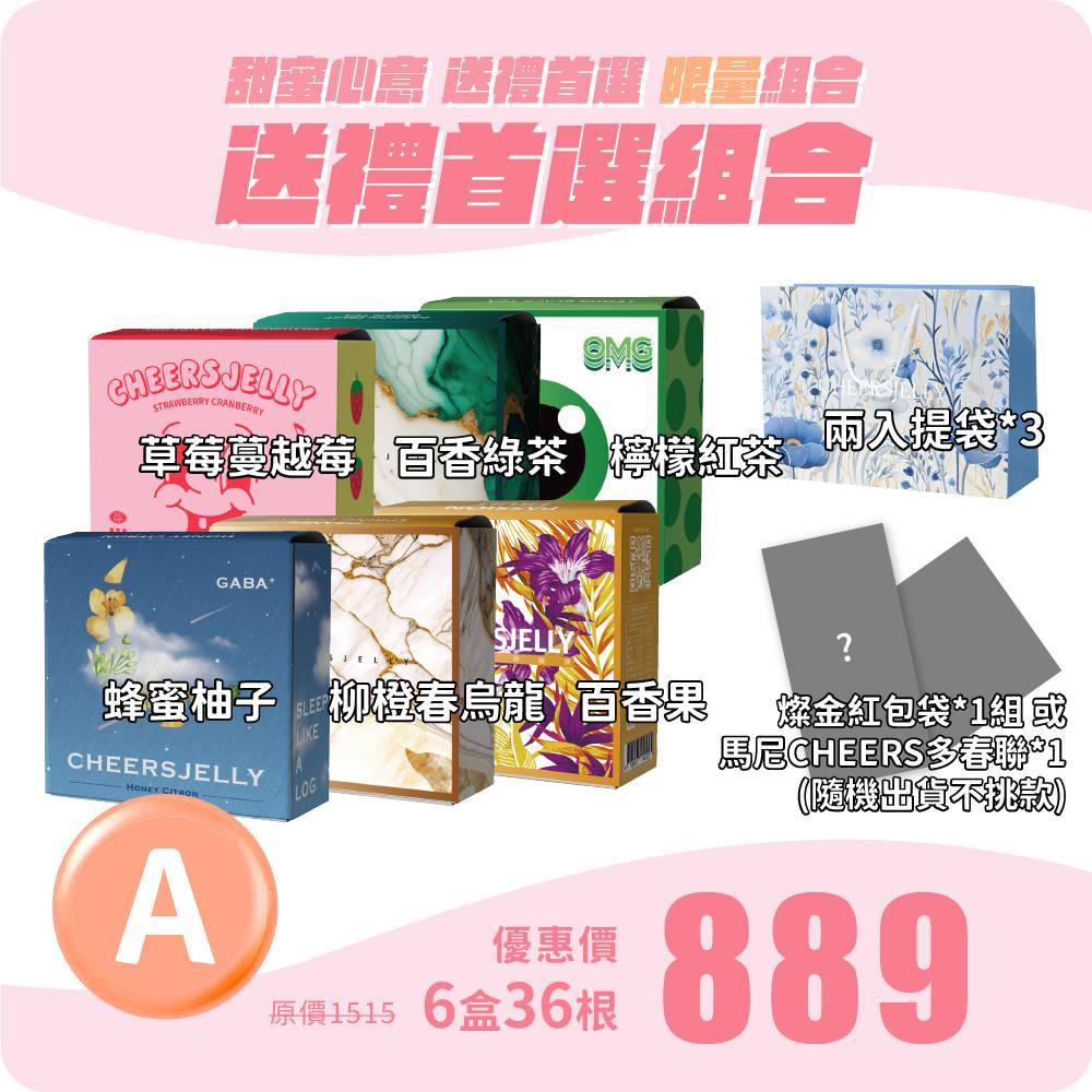 CHEERSJELLY 【送禮首選組合A】舉杯低卡蒟蒻凍(6盒共36根入)草莓蔓越莓 百香果 百香綠茶 柳橙春烏龍 檸檬紅茶 蜂蜜柚子,附兩入提袋*3(燦金紅包袋或春聯 擇1,隨機出貨)